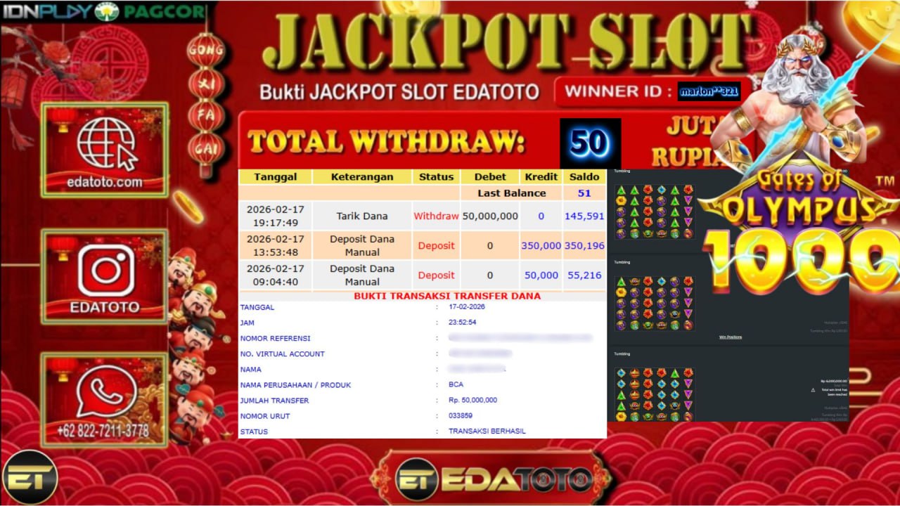 Selamat Kepada Pemilik user ID : marlon**321 Hari/Tanggal : Selasa/ 1 februari 2026 Jackpot : Rp, 49,821,200 JT Withdraw : . . .
