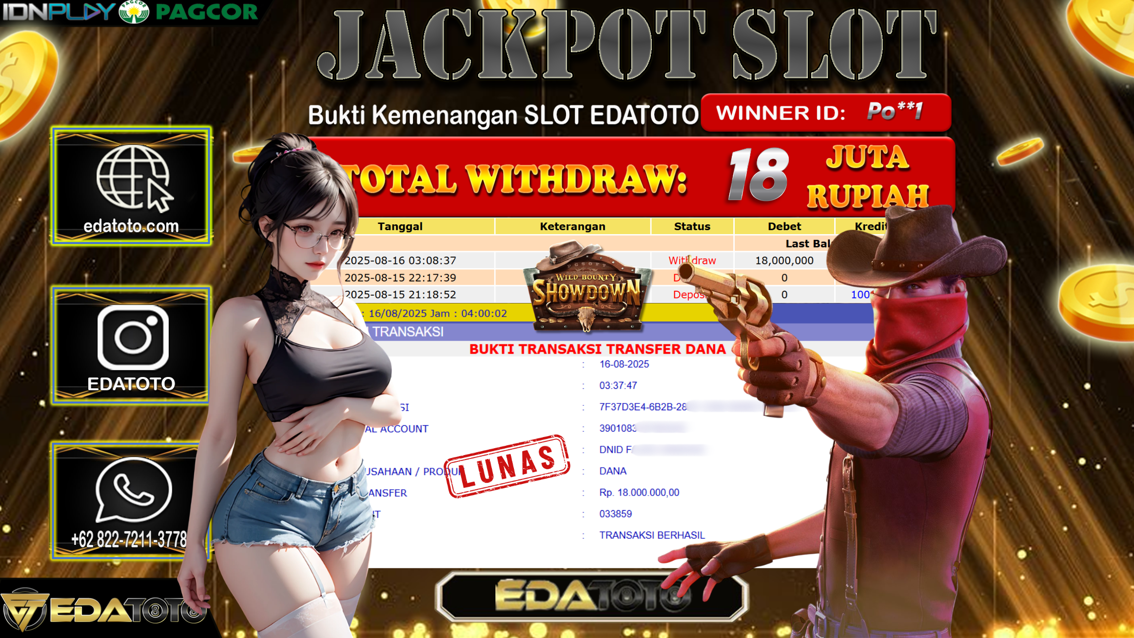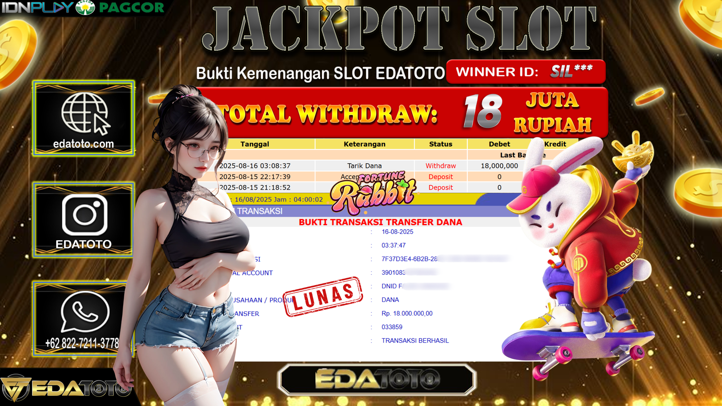 Selamat Kepada Pemilik user ID : SiL*** Hari/Tanggal : Sabtu/ 16, Agustus 2025 Jackpot : Rp. 18.000.000 JT Permainan : . . .